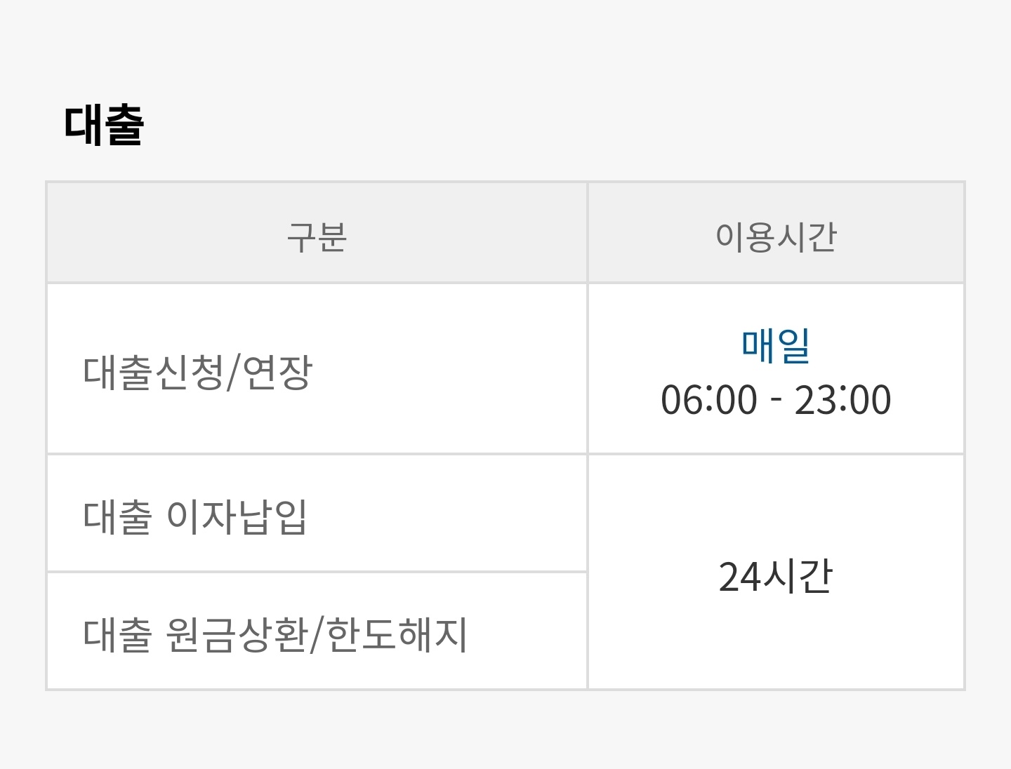 | 대출 신청 / 연장 : 매일 06시 ~ 23시 대출 이자 납입 : 24시간 대출 원금상환/한도해지 : 24시간 대출신청 시 서류 제출이 가능한 시간 : 평일/토요일 08시 ~ 22시, 일요일/공유일 불가 |