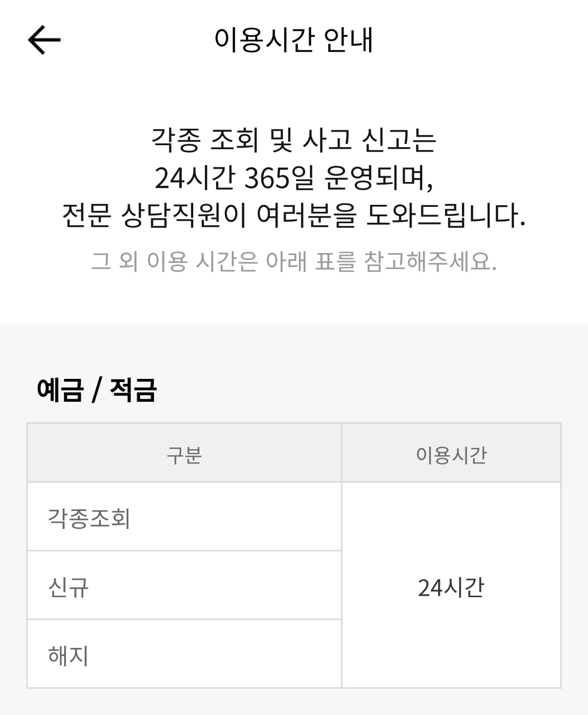 | 각종조회 : 24시간 카드신청/해지 : 24시간 카드승인 : 24시간 한도변경거래 : 매일 06시 ~ 24시 |