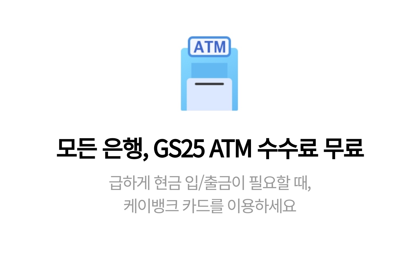 케이뱅크 체크카드라면 모두 적용되는 ATM(현금입출금기) 수수료 무료 혜택입니다.