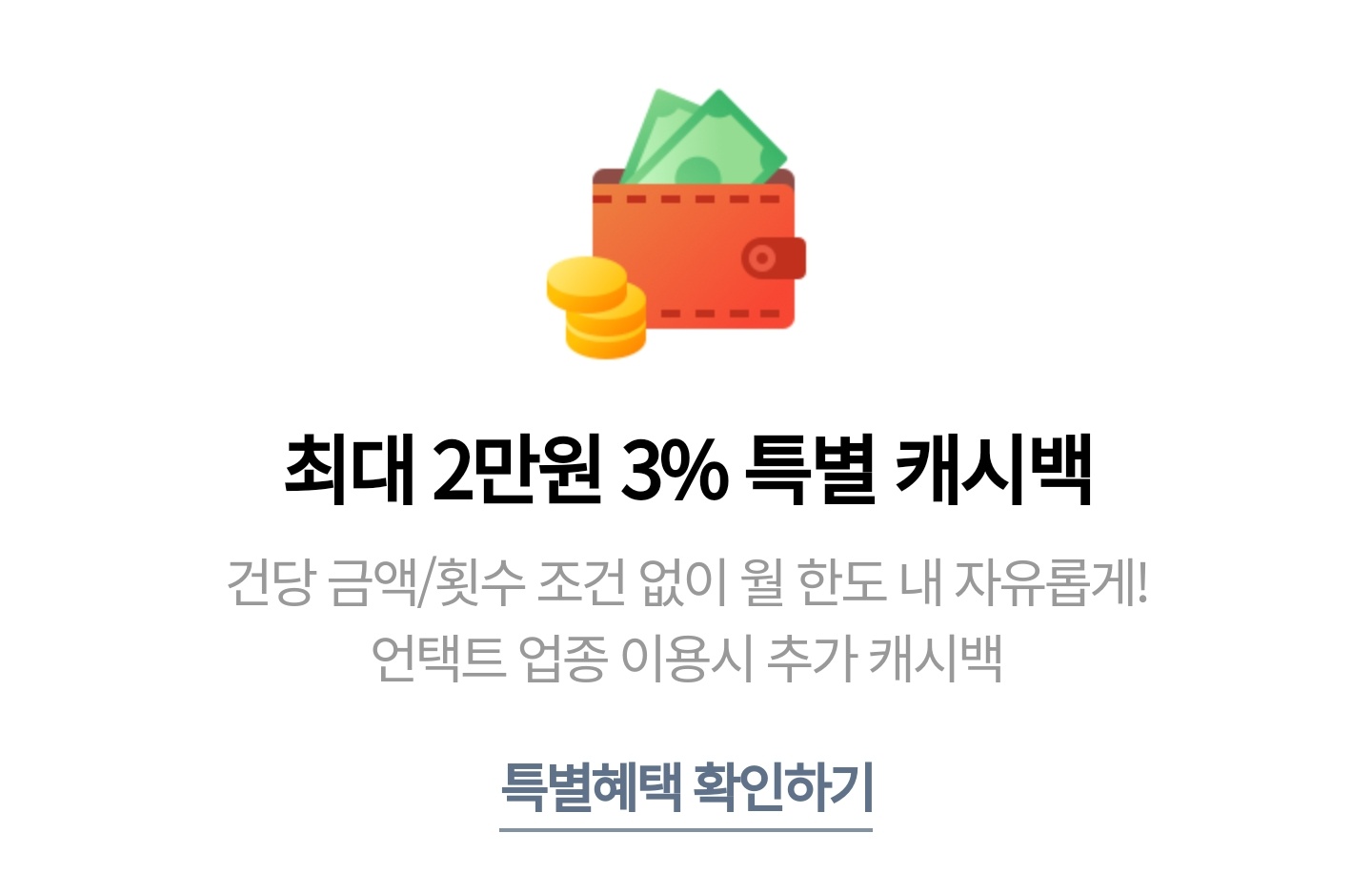 건당 금액/횟수 조건 없이 월 한도 내 자유롭게 언택트 업종 이용시 추가 캐시백을 받을 수 있습니다.