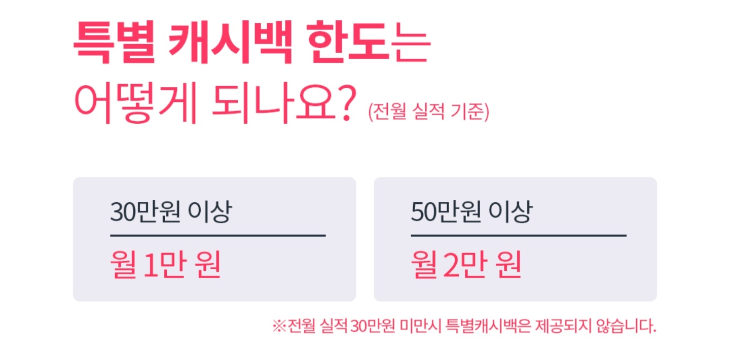 특별 캐시백은 실적이 30만원 이상은 최대 월 1만원, 50만원 이상은 최대 월 2만원 3% 캐시백 입니다.