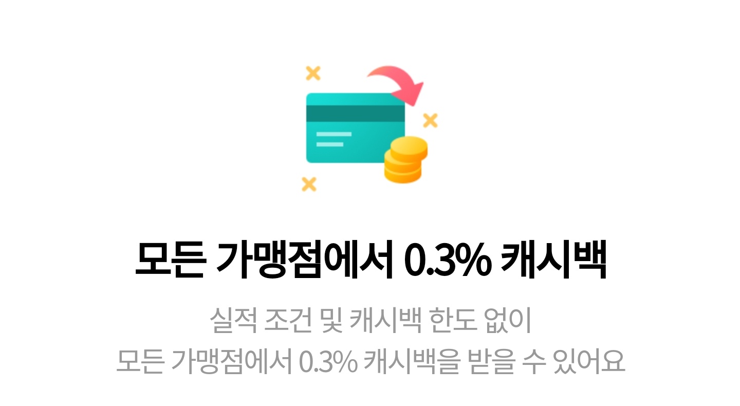 실적 조건 및 캐시백 한도 없이 모든 가맹점에서 0.3% 캐시백을 받을 수 있습니다.