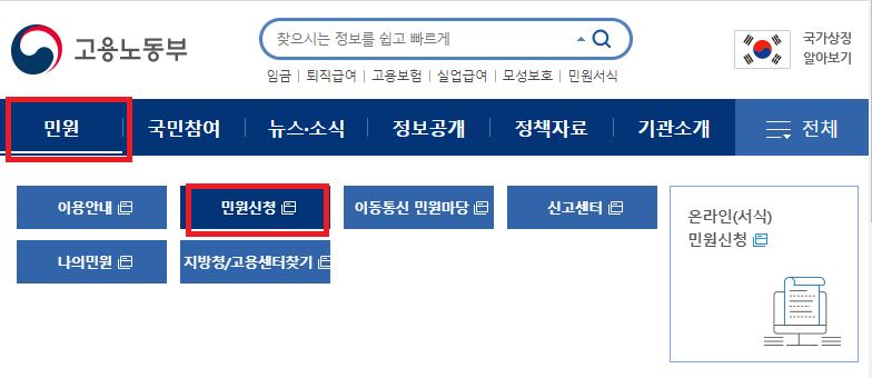 고용노동부 사이트 접속 - 민원 - 민원신청 |