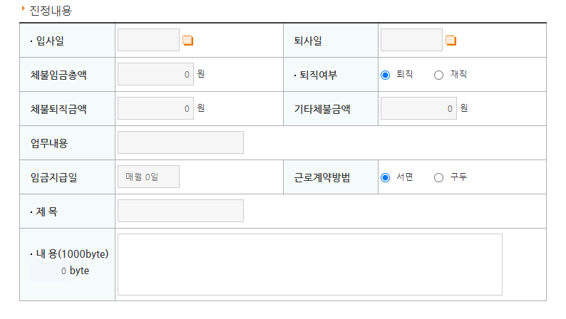 | 진정내용 입력 - 입사일, 퇴직여부, 제목, 내용 필수 작성 - 근로계약방법은 서면 또는 구두로 했는지 선택 - 내용은 1000byte 이므로 대략 띄어쓰기 포함 500자 이내로 요점만 작성 내용 예시) 진정인은 2015.3.15. 한국회사(주)에 입사하여 7개월동안 근무하였으나, 회사사정이 어렵다는 이유로 2015.9월부터 2개월간 3,000,000원의 임금을 지급받지 못함. |