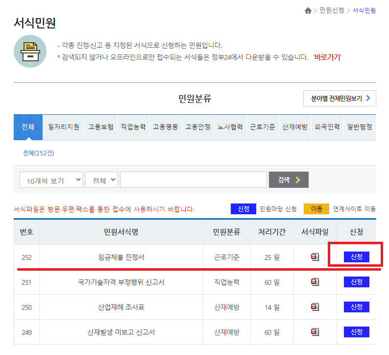 임금체불 진정서 - 신청 버튼 클릭 한다 |