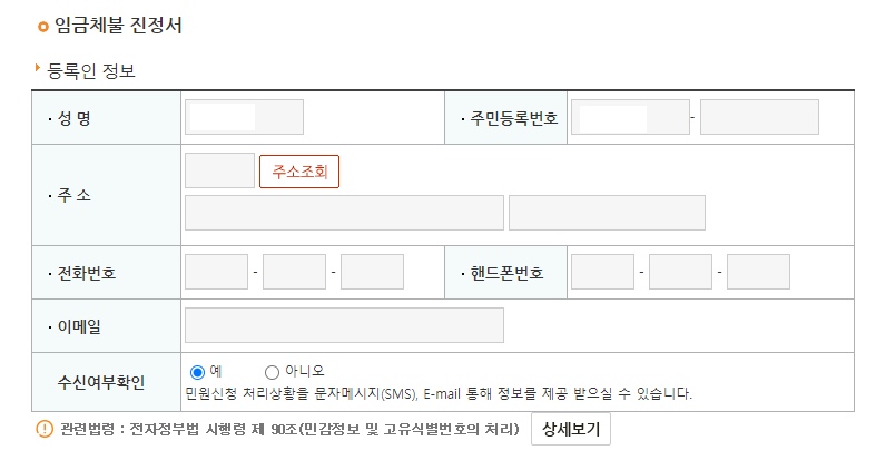 | 등록인 정보 입력 - 성명, 주민등록번호, 주소, 전화번호, 핸드폰번호, 이메일 입력 - 수신여부 확인에 "예" 를 선택해야 민원처리 상황을 문자로 제공 받을 수 있습니다. 광고가 아니니 "예"를 선택 |