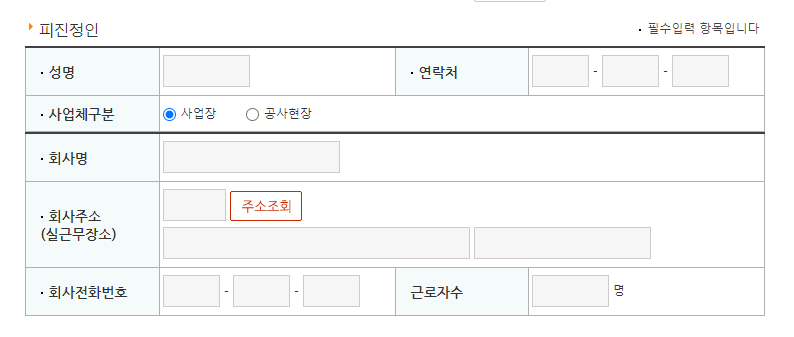 | 피진정인 정보 입력(피의자, 고소당하는 사람) - 성명, 연락처, 사업체구분, 회사명, 실근무장소, 회사전화번호를 입력 |