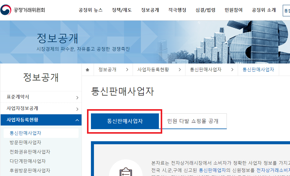 | 정보공개 - 사업자등록현황 - 통신판매사업자 - 온라인 상거래를 위해 통신판매사업자 신고가 되어 있어야 하기 때문에 통신판매사업자 확인을 합니다. |