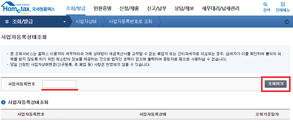 | 사업자등록번호를 입력하고 조회하기 버튼을 클릭한다 |