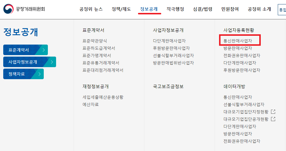 | 정보공개 - 사업자등록현황 - 통신판매사업자 - 온라인 상거래를 위해 통신판매사업자 신고가 되어 있어야 하기 때문에 통신판매사업자 확인을 합니다. |