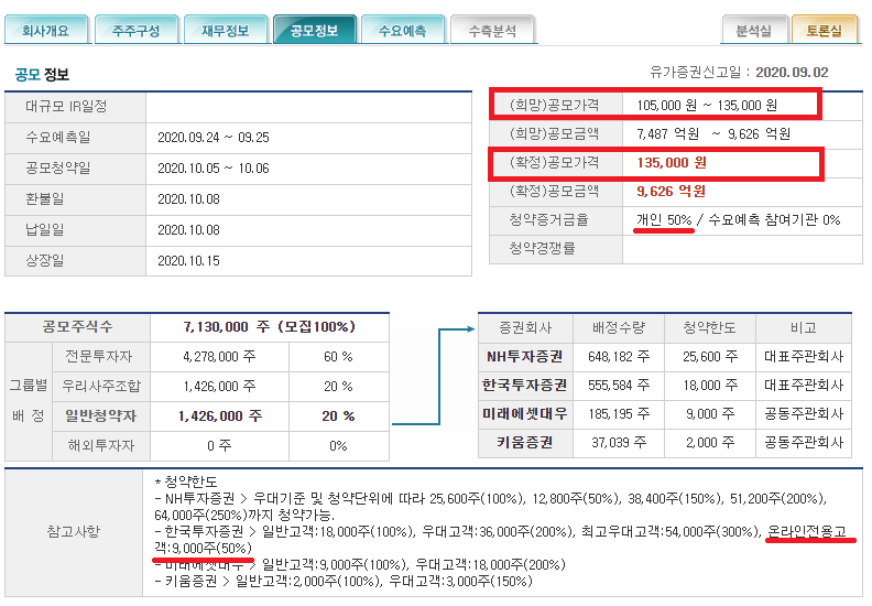 | 기관수요 예측 경쟁률이 1,117:1 을 기록 했으며 투자 수요예측 결과 90% 이상 135,000원을 제시하였기 때문에 135,000원으로 결정되었습니다. |