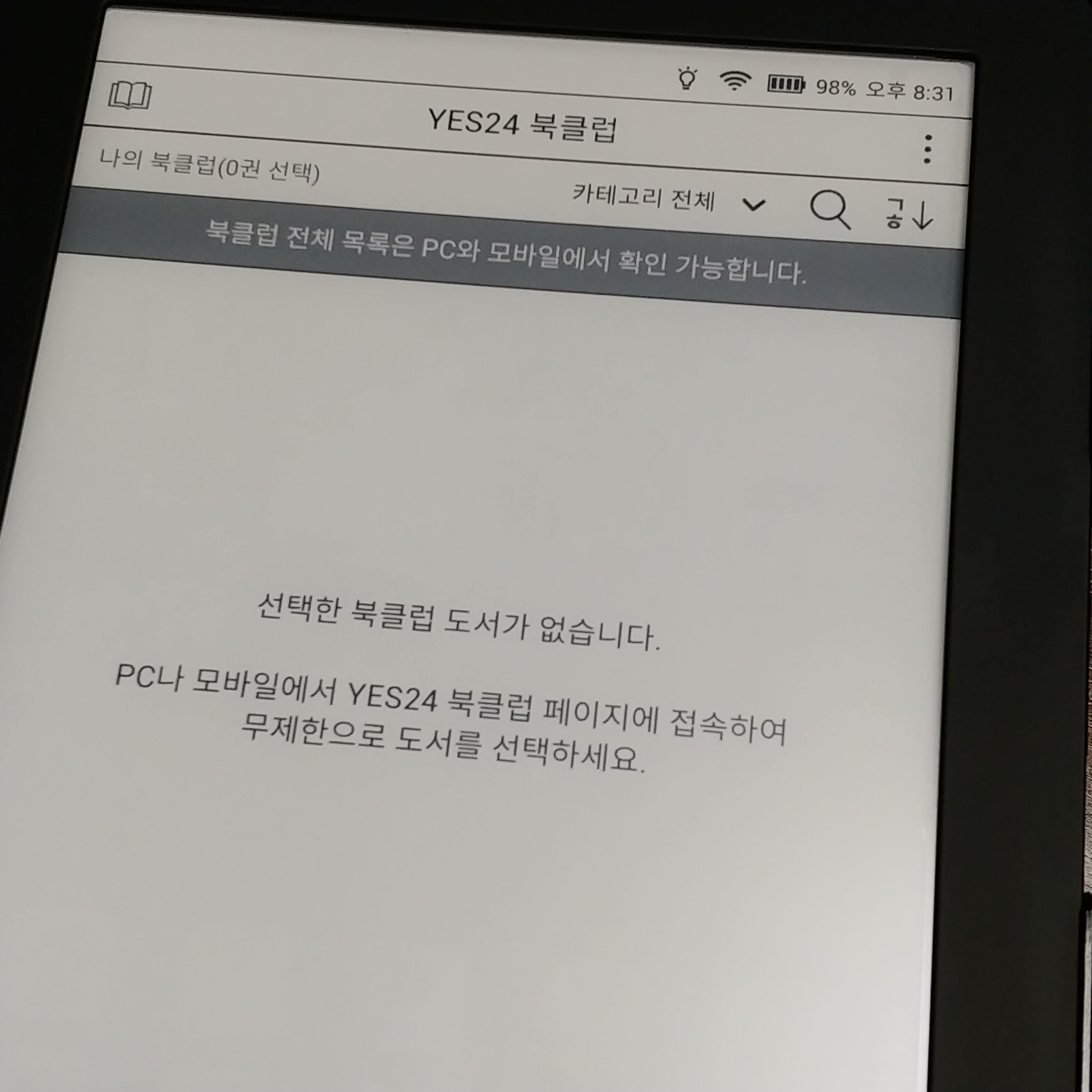 eBook 리더기 크레마 그랑데로 yes24 북클럽 이용시 단점은 PC나 모바일에서 yes24 북클럽 접속하여 도서를 선택해야 한다는점 입니다.