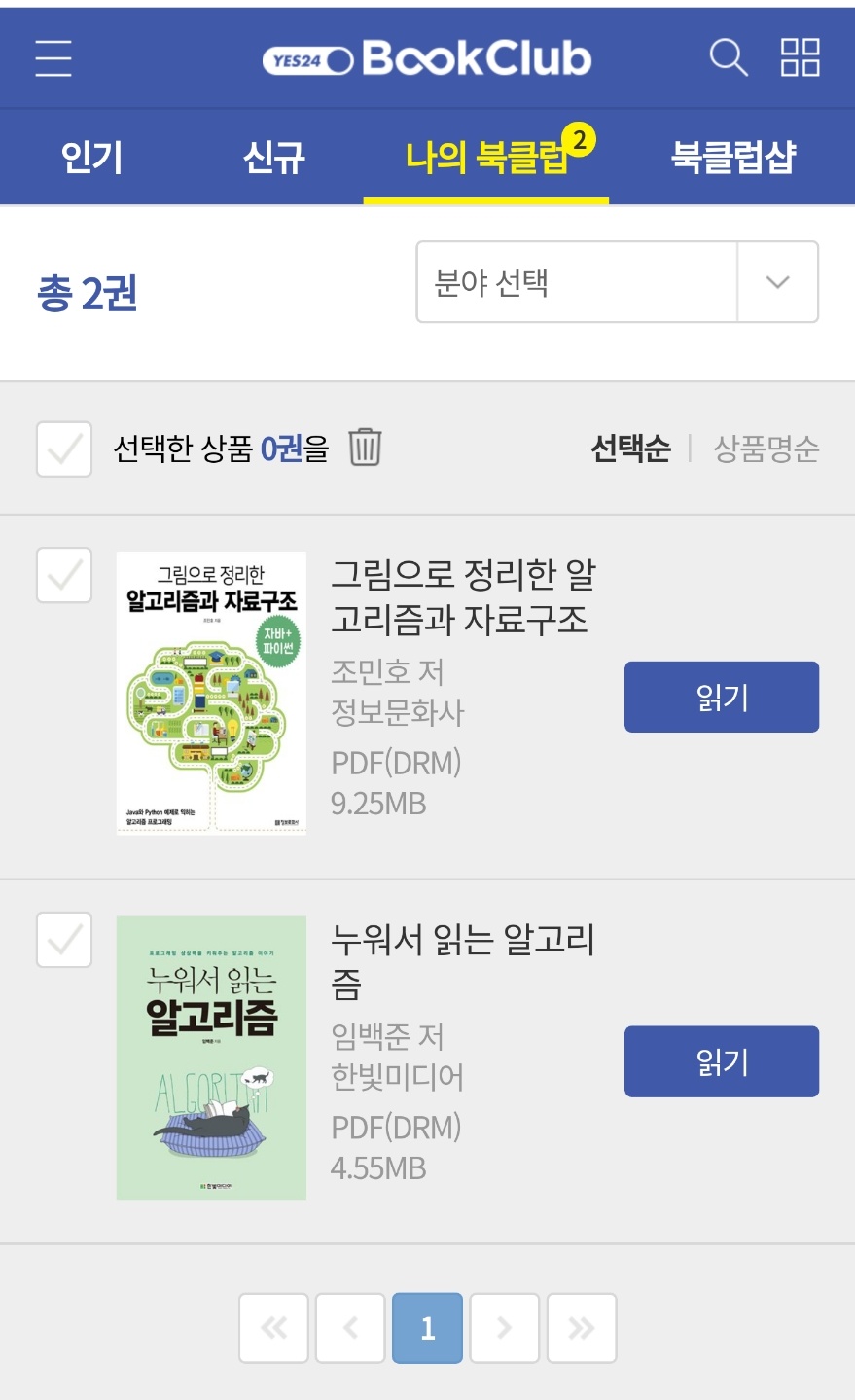 그래서 핸드폰에 예스24 도서 어플 설치 후에 북클럽에서 필요한 책들을 선택하여 담아줬습니다.