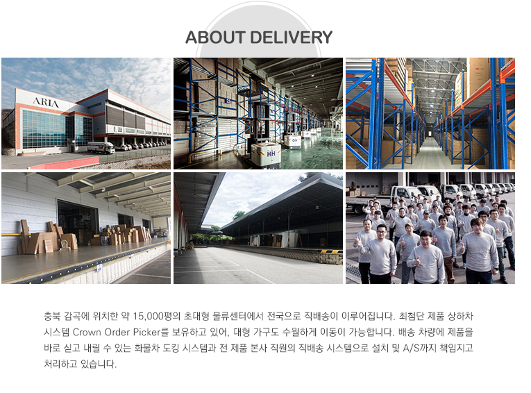 충북 감곡에는 15,000평의 초대형 물류센터에서 전국으로 직배송 하고 있고 아울렛도 있어서 직접 구매를 하러 갈 수도 있습니다.