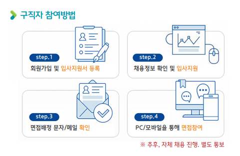 | 1. 회원가입 및 입사지원서 등록 2. 채용정보 확인 및 입사지원 3. 면접배정 문자/메일 확인 4. PC/모바일을 통해 면접참여 |