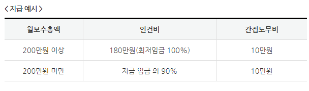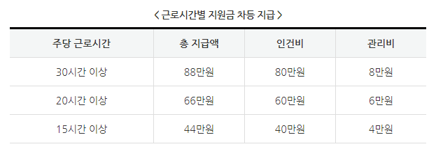 | * 지원기간 - 2020.12.31.까지 채용한 청년의 채용일로부터 최대 6개월까지 지원 * 지원한도 - 사업 참여 신청 직전 월말 기준으로 고용보험 피보험자수의 20% 이내(최대 30명 상한) 단, 사업 확대 등 필요시 운영기관의 승인을 받은 경우 피보험자 수의 60%까지 가능(최대 30명 상한) - 참여청년의 정규직 전환, 자발적 퇴사 등에 따른 추가 채용 시에는 해당 참여청년의 잔여 지원기간 내에서 지원 가능 * 지원수준 - 참여청년 1인당 인건비(최대 월 80만원)와 관리비(인건비의 10%, 최대 월 8만원) |