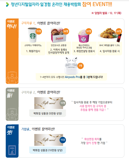 청년디지털일자리 일경험지원사업 온라인 채용박람회 참여이벤트도 있으니 놓치지 말고 참여해보세요.