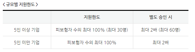 | * 지원한도 - 참여일 전월 말일 기준 근로자수를 초과하여 지원할 수 없음(기업 당 최대 30명 한도) 예) 디지털 일자리 사업으로 참여 당시, 기준 근로자 수가 20명이었다면 이 기업의 지원 한도는 20명이며, 최초 근로자 수가 50명이었다면 30명까지 지원 대형 IT 프로젝트 수행 등 필요시 2배까지 한도 확대 |