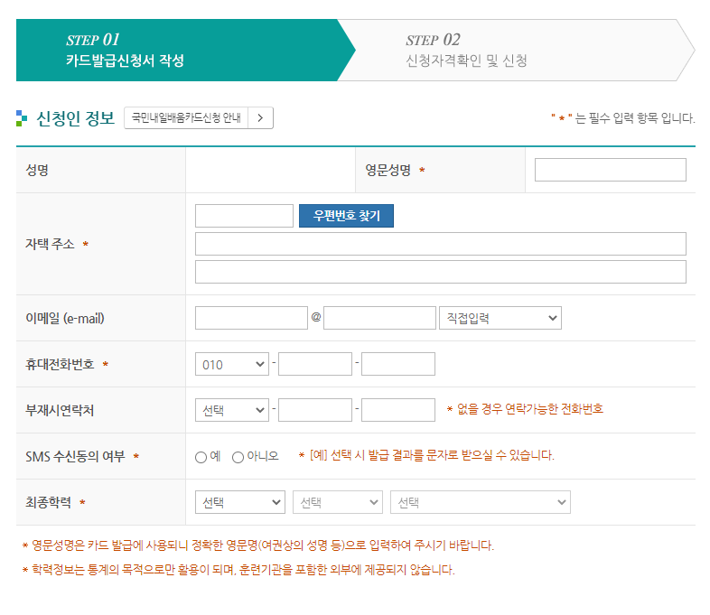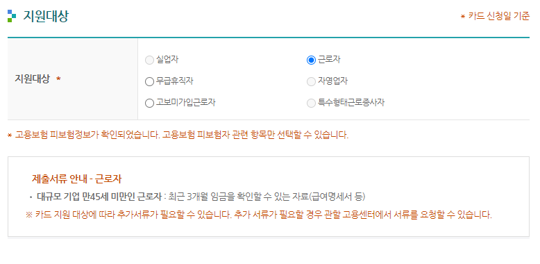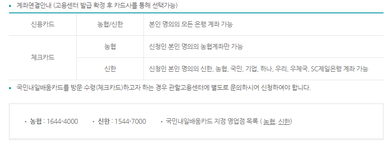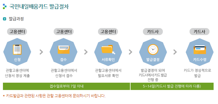 | 고용센터 신청 - 관할고용센터에 신청서 정상 제출 고용센터 접수 - 관할고용센터에서 신청서 접수 고용센터 서류 확인 - 관할고용센터에서 필요서류 확인 카드사 발급결정 - 발급결정이 되어 카드사에서 카드 발급 진행중 카드사 카드수령 - 카드가 정상적으로 발급 |