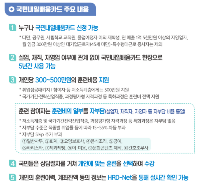 | 1. 누구나 국민내일배움카드 신청 가능 - 공무원, 사립학교 교직원, 졸업예정자 이외 재학생, 연 매출 1억 5천만원 이상의 자영업자, 월 임금 300만원 이상인 대기업근로자(45세 미만), 특수형태근로 종사자는 제외 2. 실업, 재직, 자영업 여부에 관계 없이 국민내일배움카드 한장으로 5년간 사용가능 3. 개인당 300~500만원의 훈련비용 지원 * 취업성공패키지 I 참여자 등 저소득계층에게는 500만원 지원 * 국가기간, 전략산업직종, 과정평가형 자격과정 등 특화과정은 훈련비 전액 지원 4. 국민들은 상담절차를 거처 개인에 맞는 훈련을 선택하여 수강 5. 개인의 훈련이력, 계좌잔액 등의 정보는 HRD-Net을 통해 실시간 확인 가능 |
