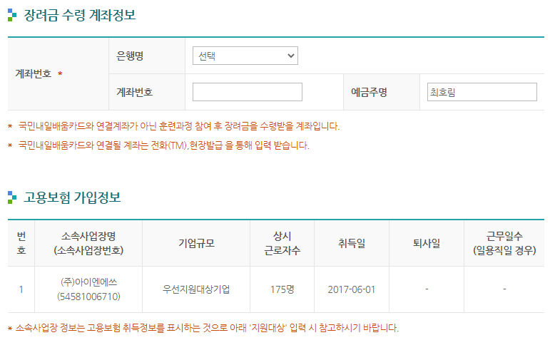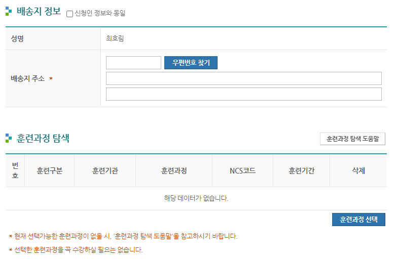 - 온라인 발급신청 시 1개 이상 등록해야 하므로 미리 훈련과정을 확인합니다