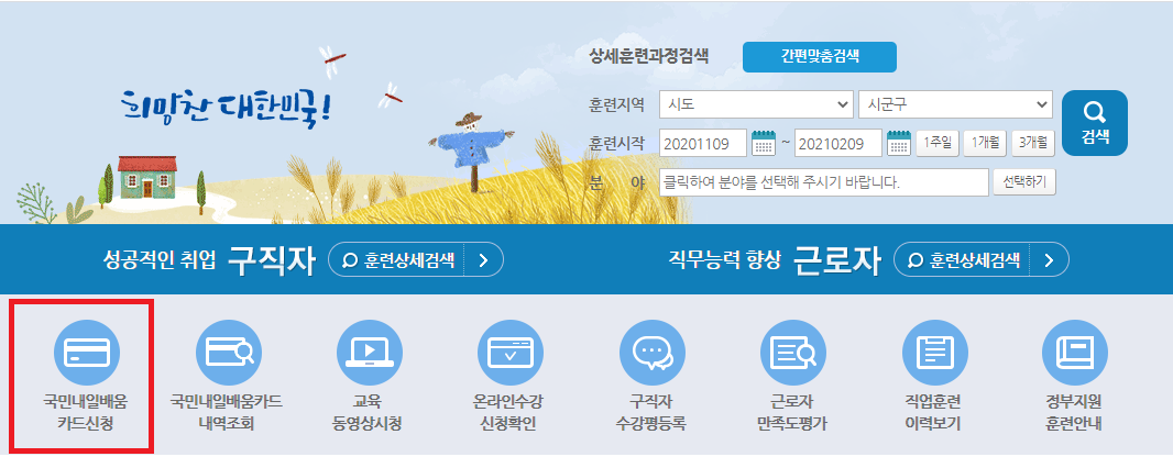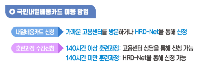취업 관련교육, 직업훈련, 취미생할 교육 등 다양한 교육과정을 수강할 때 국비지원을 받을 수 있는 카드 입니다.