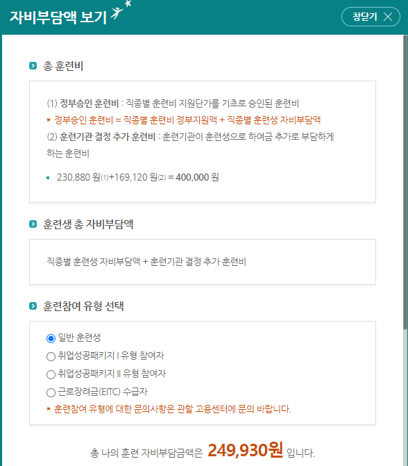 자기부담금액을 확인해보니 전 일반훈련생이라 249,930원이 나오네요.