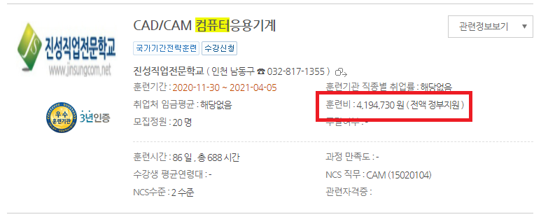 CAD/CAM 컴퓨터응용기계를 조회 해보니 훈련비가 전액 정부지원 입니다.