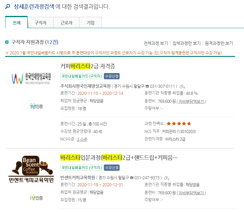 아쉽게도 수원시에서 진행하는 바리스타 과정에 국비지원 무료 교육은 없네요.