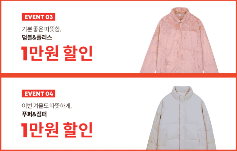 | 콜라보잠옷 1+1 패딩조끼 1만원 할인 코드/자켓균일가 69900원, 99900원 스웨커&가디건 1만원 할인 |
