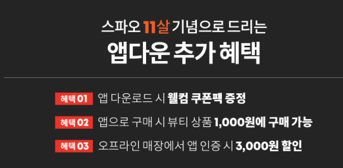 | 앱 다운로드 시 웰컴 쿠폰팩 증정 앱으로 구매시 뷰티 상품 1000원에 구매 가능 오프라인매장에서 앱 인증시 3000원 할인 |