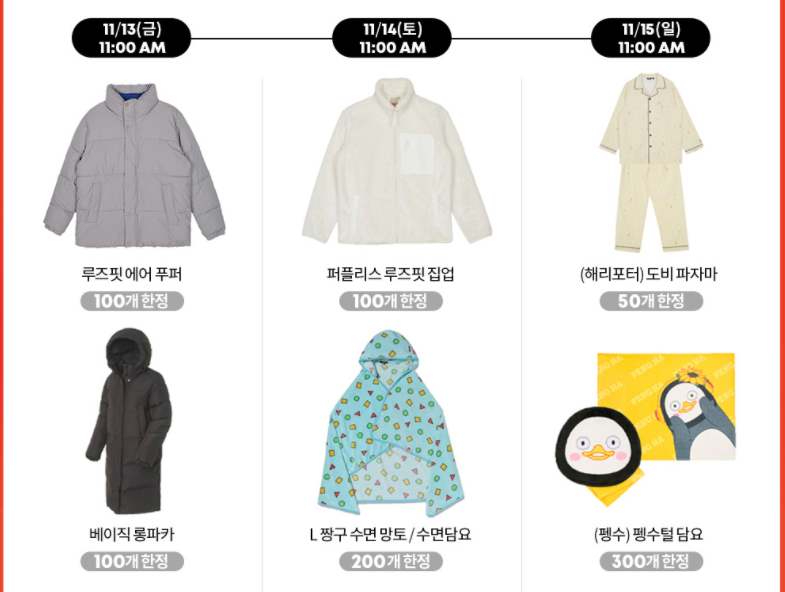 | 11/13(금) : 루즈핏에어 푸퍼, 베이직 롱파카 11/14(토) : 퍼플리스 루즈핏집업, L짱구 수면망토/수면담요 11/15(일) : (해리포터)도비 파자마, (펭수)펭수털담요 |