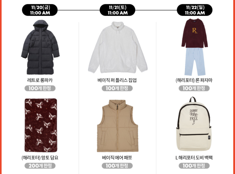 | 11/20(금) : 레트로 롱파카, (해리포토)망토 담요 11/21(토) : 베이직퍼플리스 집업, 베이직에어 패쪼 11/22(일) : (해리포터)론 파자마, L해리포터 도비 백팩 |