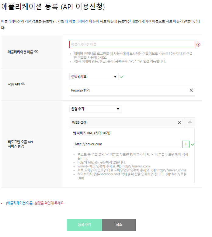 웹서비스 URL 은 네이버 그대로 넣으셔도 됩니다.