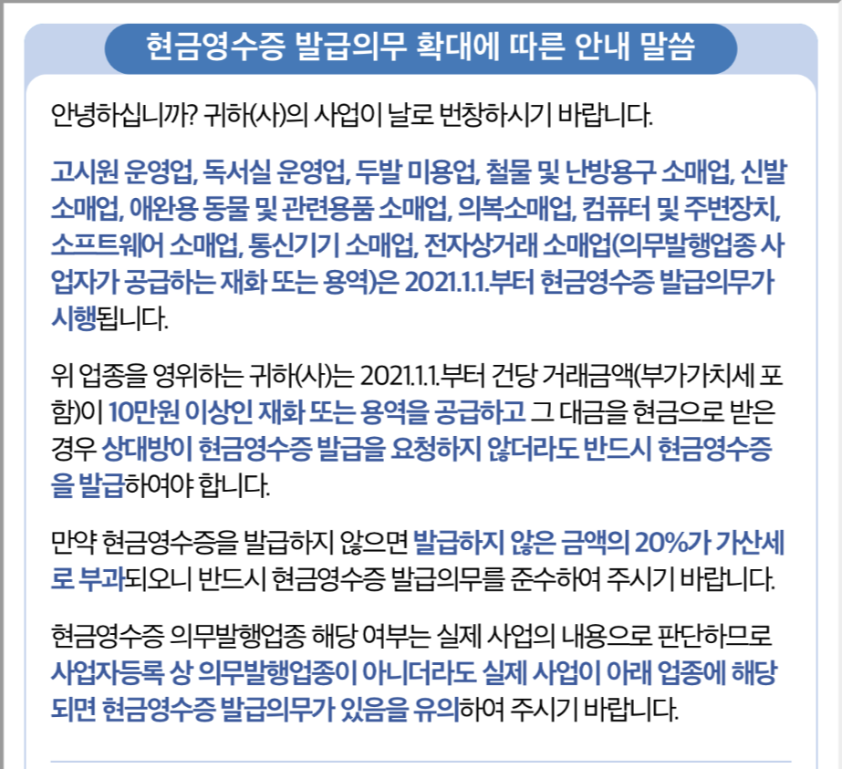 2021년부터 현금영수증 의무발행업종으로 변경되었으니