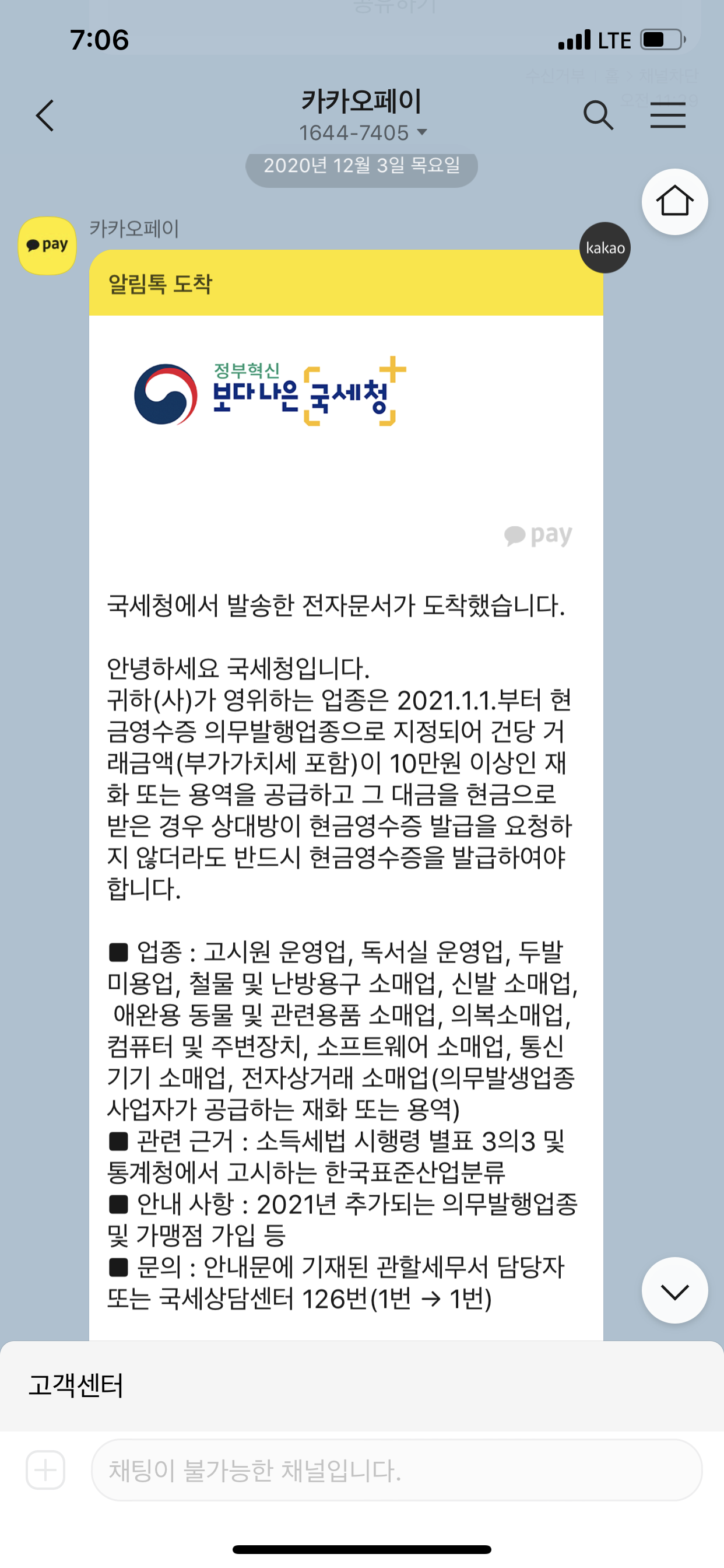 국세청으로부터 현금영수증 의무발행업종으로