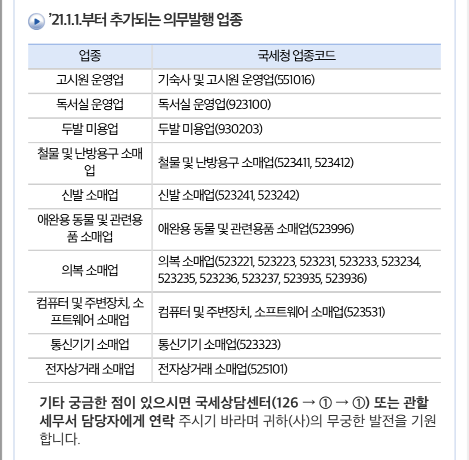 21년부터 추가되는 현금영수증 의무발행 업종