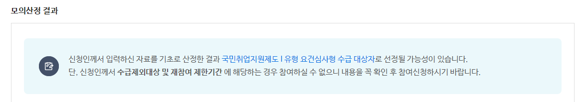 - 모의 산정 결과로 어떤 유형의 수급 대상자인지 확인 해 보실 수 있습니다