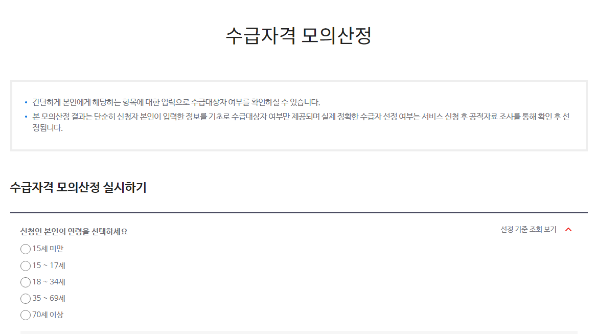 - 본인의 연령을 선택하시면 아레에 선정 기준들이 계속해서 추가가 됩니다