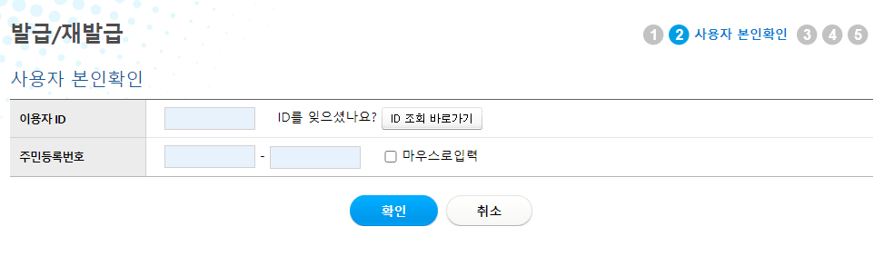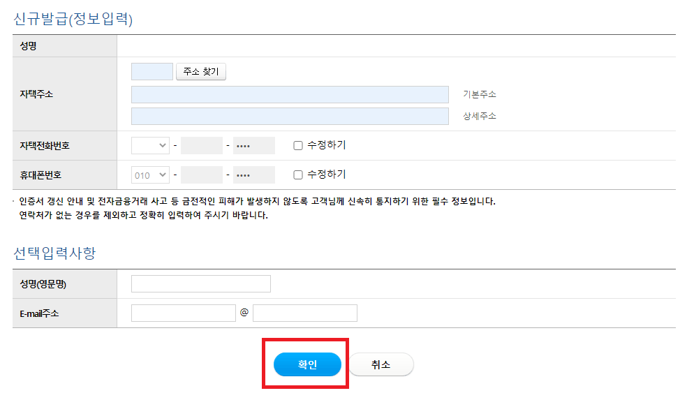 전화승인이 완료 되면 신규 발급정보 를 입력하고 확인으로 금융인증서를 발급합니다.