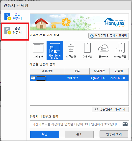 홈택스 공동인증서인 금융인증서 등록을 마쳤습니다.