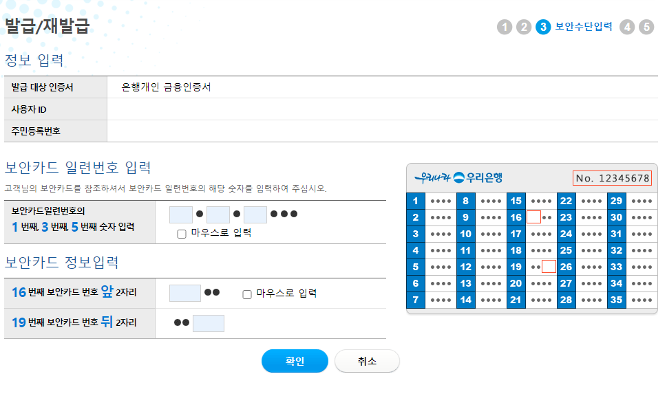 보안카드 정보 입력으로 사용자 본인확인을 계속합니다.