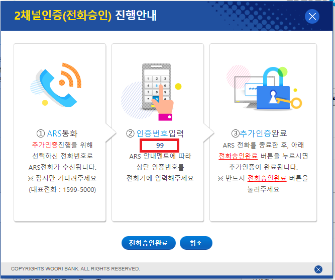 ARS통화가 오면 인증번호를 입력합니다.