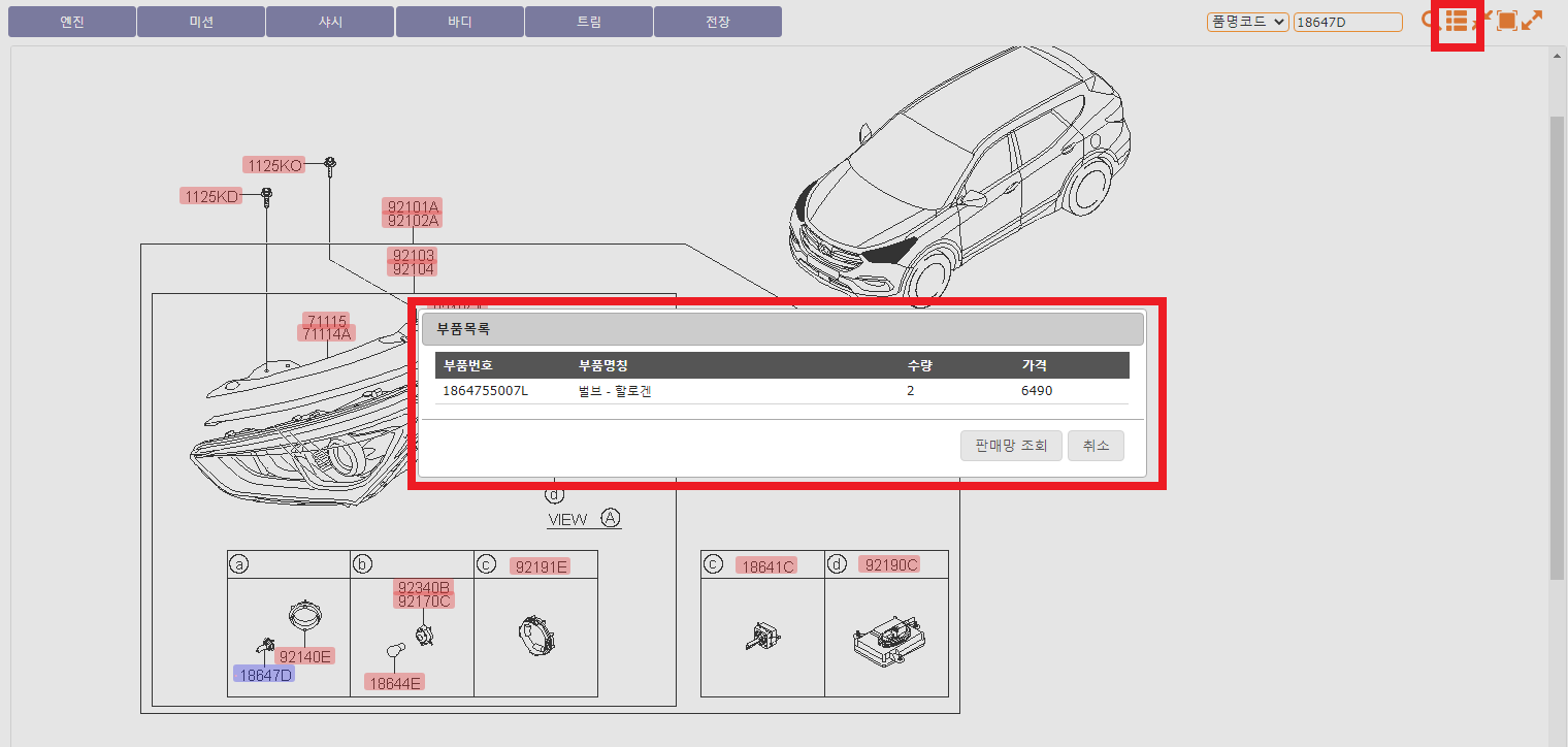 품명코드로도 조회가 가능하고 오른쪽 PartList 버튼을 클릭하여 부품번호 및 부품명칭 가격을 확인 하실 수 있습니다