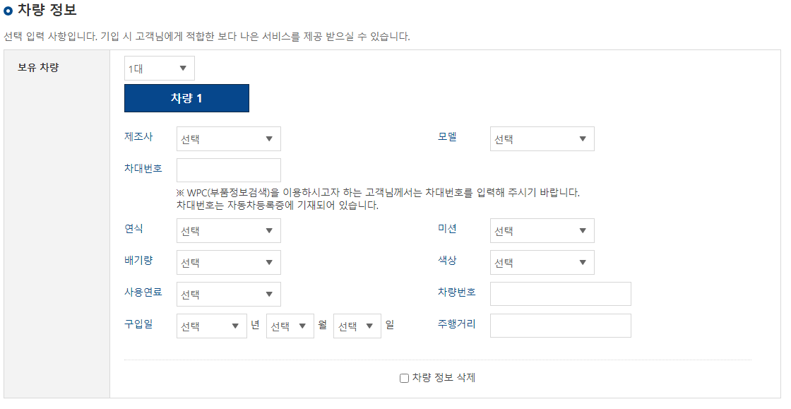 소유한 차량의 부품을 검색하기 위해서는 차대번호가 필요 합니다.