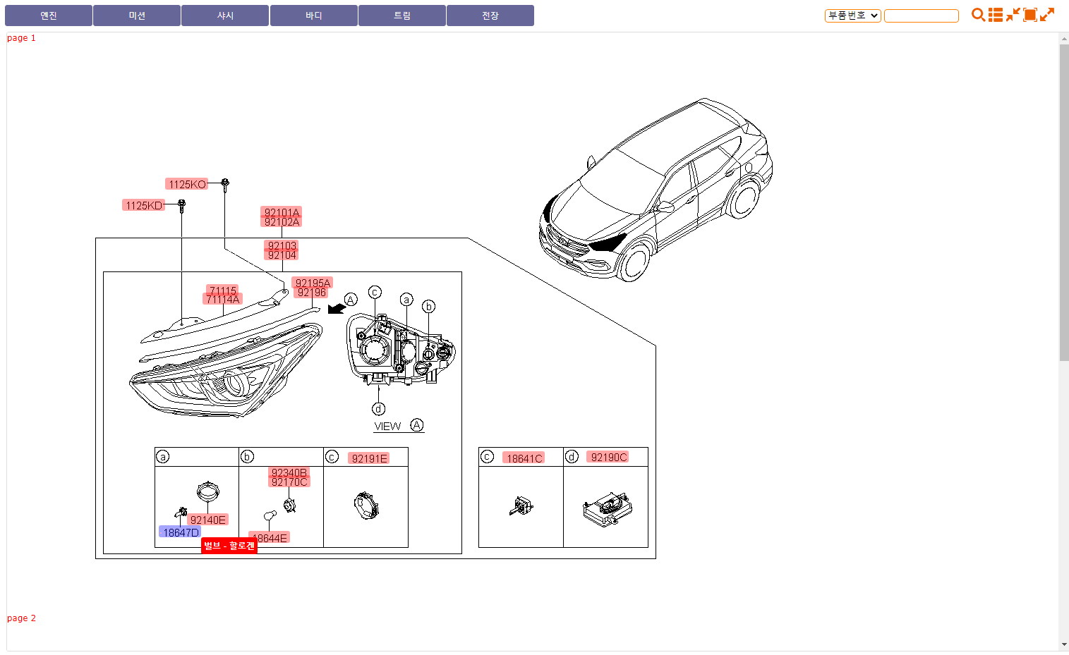 품명코드로도 조회가 가능하고 오른쪽 PartList 버튼을 클릭하여 부품번호 및 부품명칭 가격을 확인 하실 수 있습니다