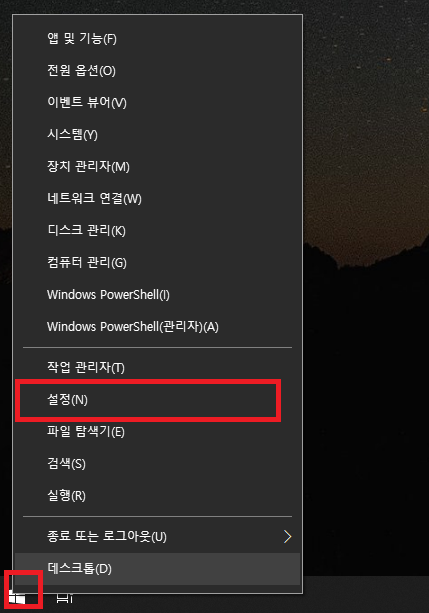1. 시작버튼 마우스 오른쪽 클릭하여 설정을 실행합니다.