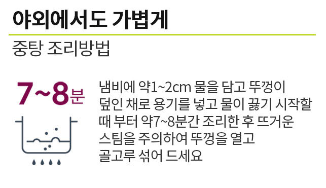 - 냄비에 약 1~2cm 물을 담고 뚜껑이 덮인 채로 용기를 넣고 물을 끓기 시작할 때부터 약 7~8분간 조리