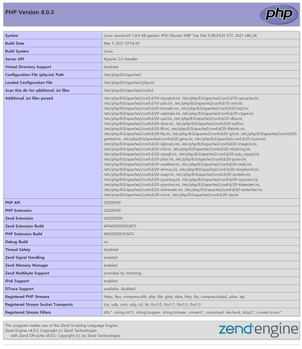 우분투 20.10 apache2 + MariaDB + PHP8.0 설치 방법