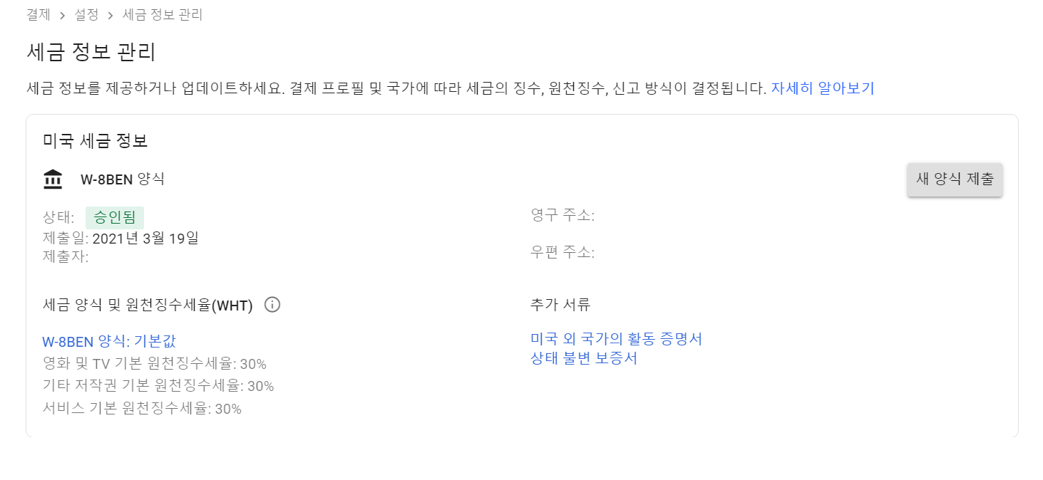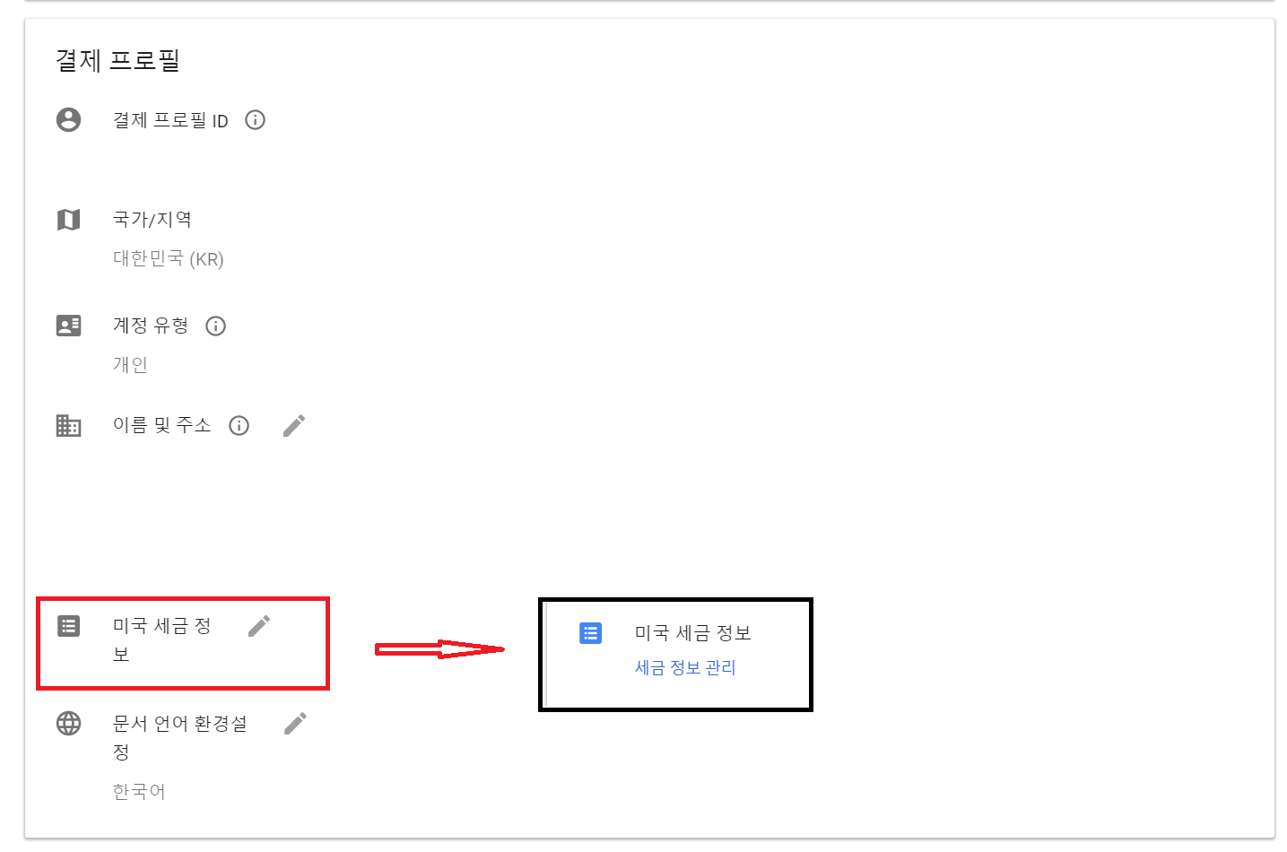 결제 프로필 - 미국 세금정보 - 세금 정보 관리